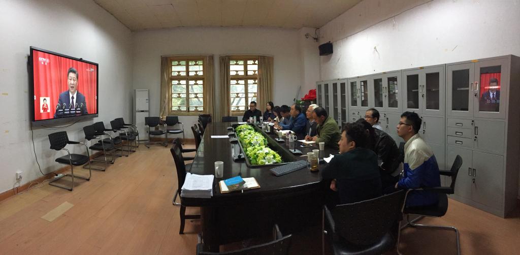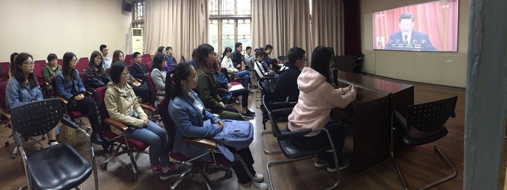 上午9时,全体在院领导和学生党员代表集体收看了十九大开幕式。教职员工、同学们怀着激动而喜悦的心情走进会场,专注认真地聆听习近平总书记的报告,手中的笔不停地记录着。