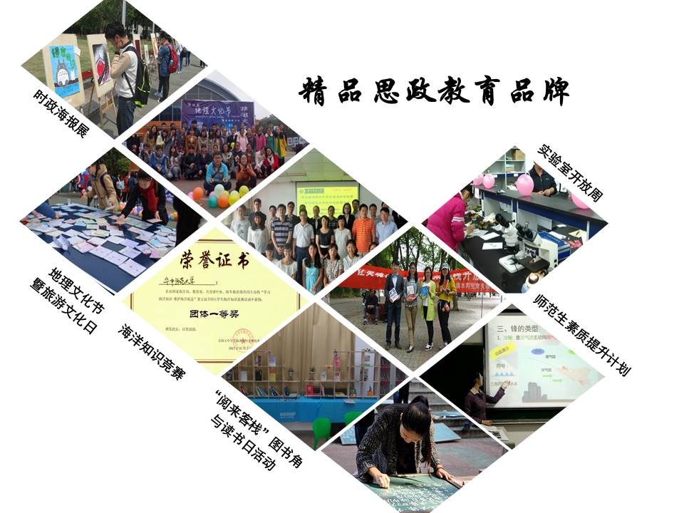 学院以“魅力城环,精彩相传”为口号,以学科背景为支撑,贴合专业特色,贴近学生特点,打造独具特色的学生工作品牌,扩大精品校园文化活动的辐射面,扩大学院的影响力。一是打造精品思政教育品牌。将学生工作与专业教育有机融合,打造地理文化节暨旅游文化日、海洋知识竞赛、“阅来客栈”、时政海报展、实验室开放周、“新生游华师”等精品思政教育品牌