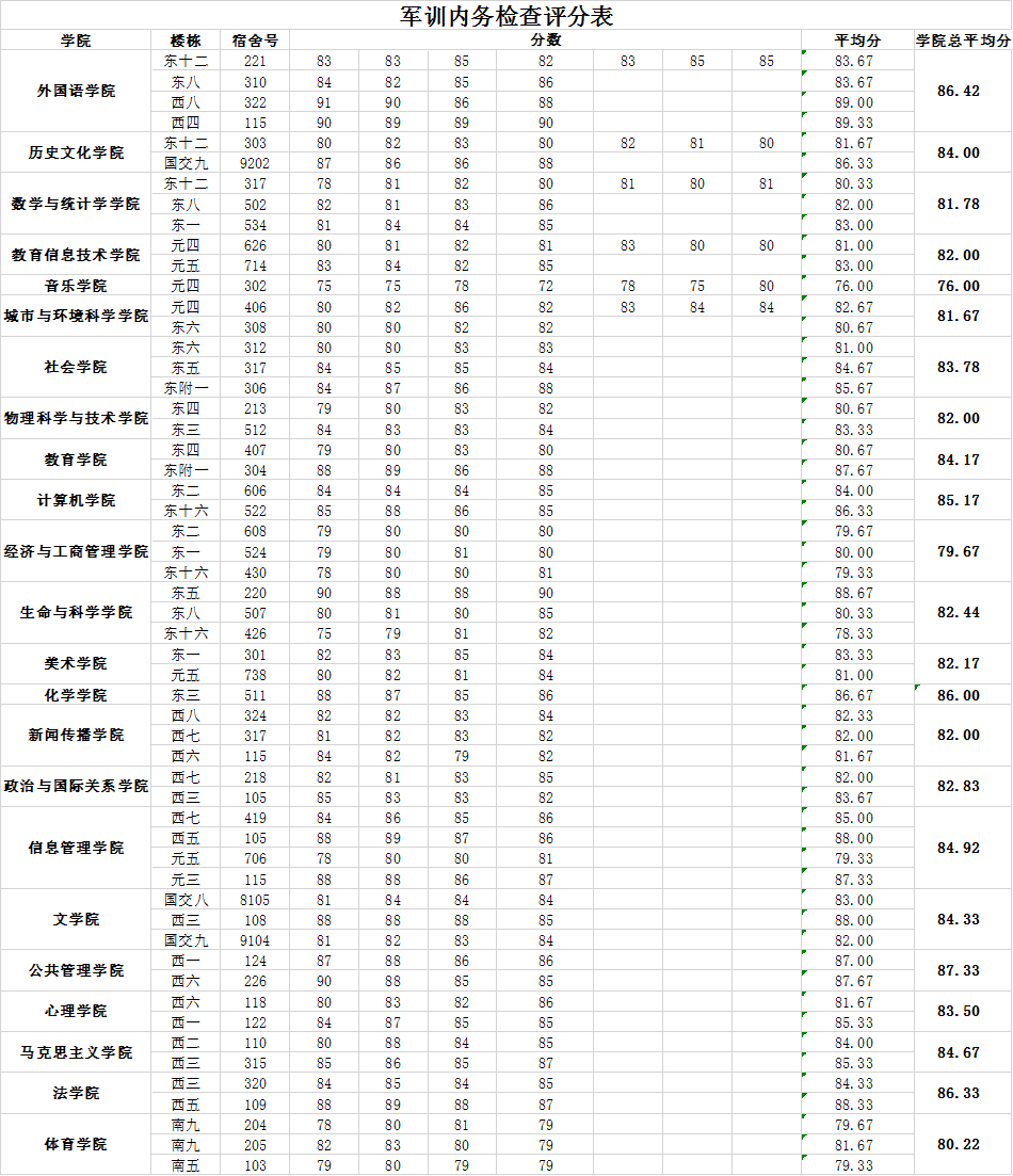 2017年军训第一次内务检查评分表(9月8日)