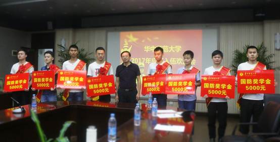 随后,校党委副书记覃红为学生们颁发国防奖学金5000元,并发表重要讲话。首先,覃红书记代表学校党委为九名新兵表示热烈的祝贺,向积极送子参军的新兵家长致以崇高的敬意。他肯定了入伍大学生为保卫国家安宁、维护世界和平做出的积极贡献。在分析当今时代格局和国家当前的情况后,他指出积极应征入伍对实现国家强军梦,进而实现中国梦的重大意义,并赞扬九位同学的积极行动为大学生树立了楷模。他对九名入伍战士提出希望:一要加强学习,提高军事政治素质;二要忠于职守,苦练军事技能,履行保家卫国的光荣任务;三要严守纪律,安心部队生活;四要牢记校训,传播华师精神,发挥专业优势,做好带头作用。并且表示,学校将与新兵保持密切联系,协助部队加强对新兵的教育和管理,并会做好后续工作,保证入伍学生回来能继续深造。